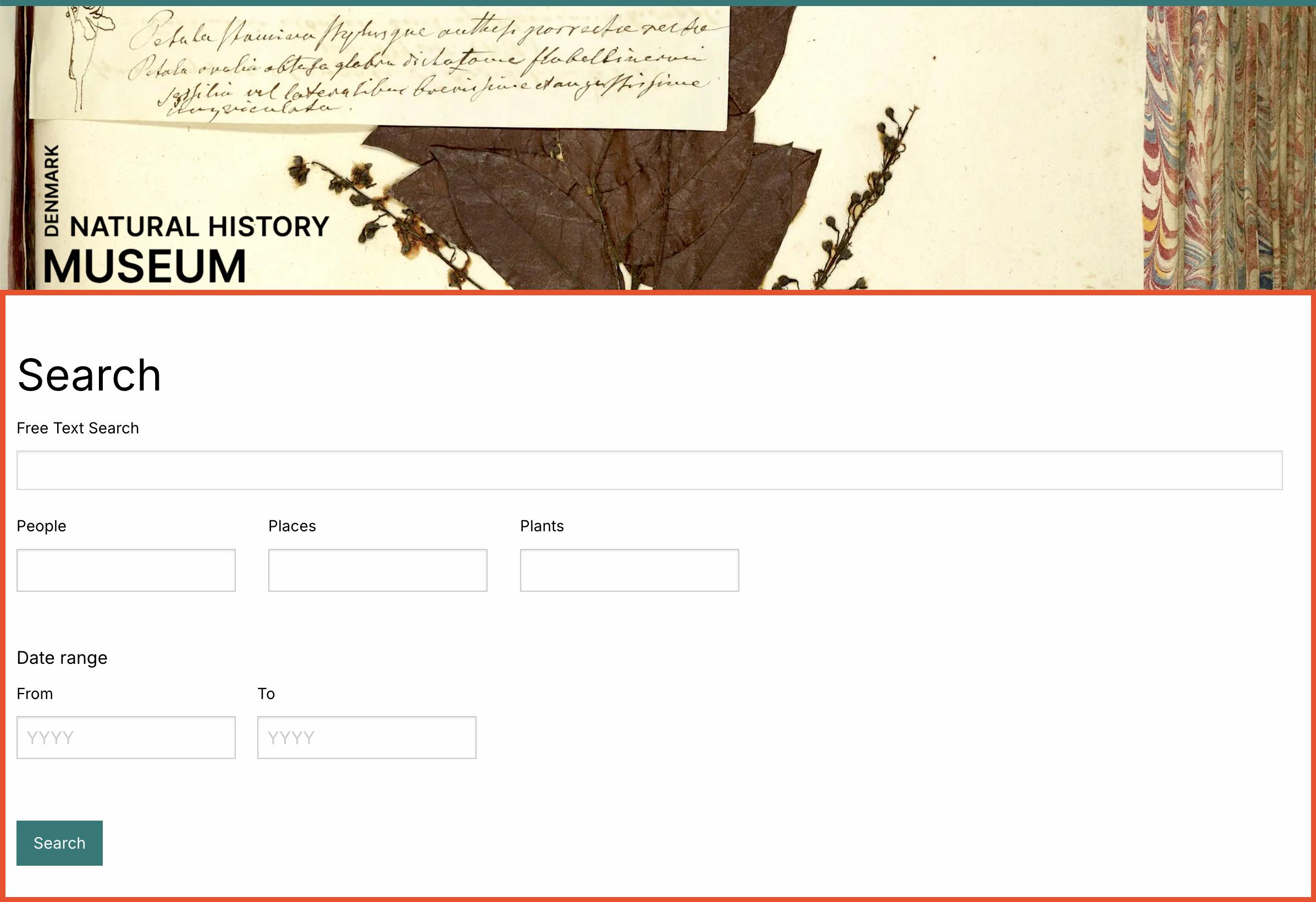 The dedicated Search Everything page starts with a Free Text Search box. Below that there are options to search People, Places or Plants. On the third row of search options you can choose a Date Range – From and To.