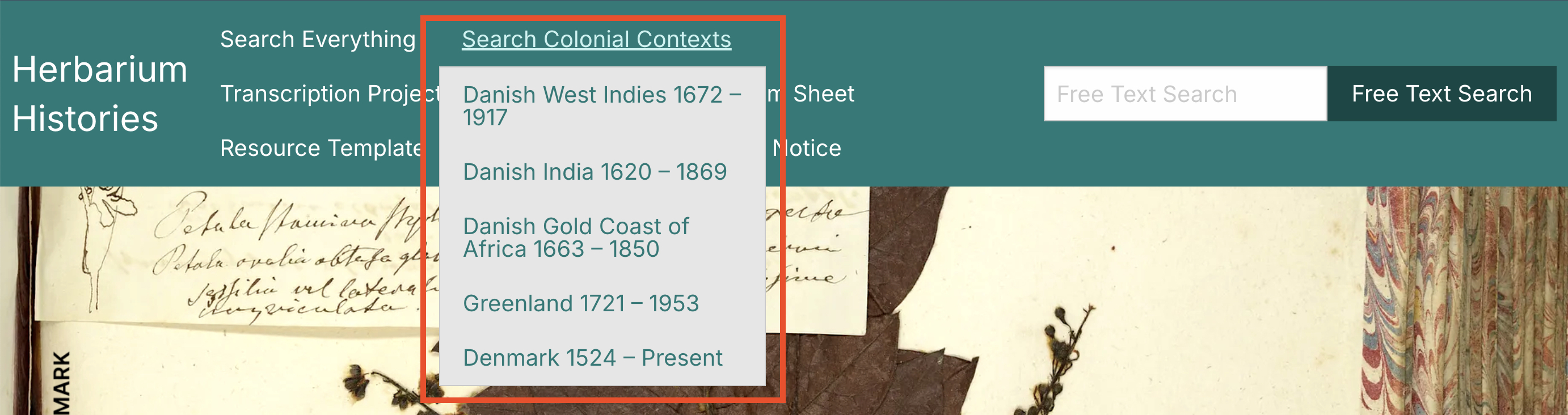 Please note that the Herbarium Histories portal contains materials from approximately 1750-1940, and the dates given here as selectable options for each of the Danish colonial geotemporal zones are for the wider (generally agreed) start and end dates of active colonisation of each of the territories. Denmark is given as a selectable option because it was the colonising state, and is therefore part of the colonisation process.