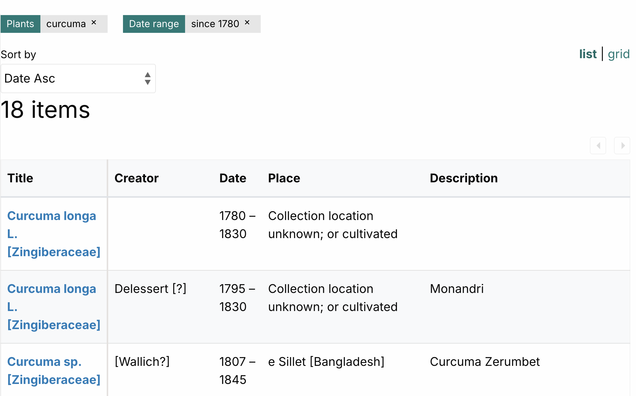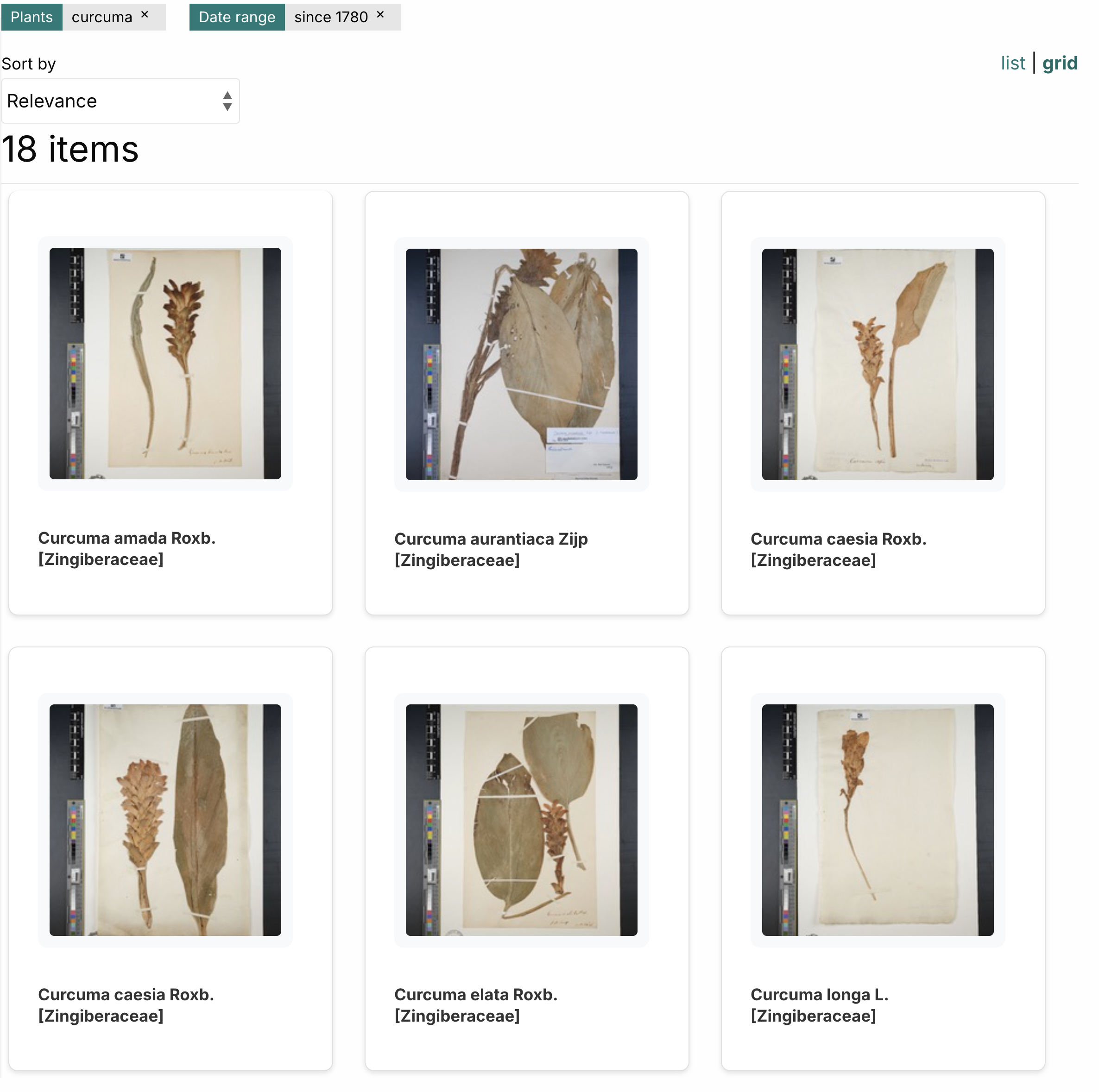 You can de-select your search terms by clicking on the 'x' in the displayed search terms, thereby widening your results. You can view your results as a list (as seen above) or as an image grid (as seen below):
