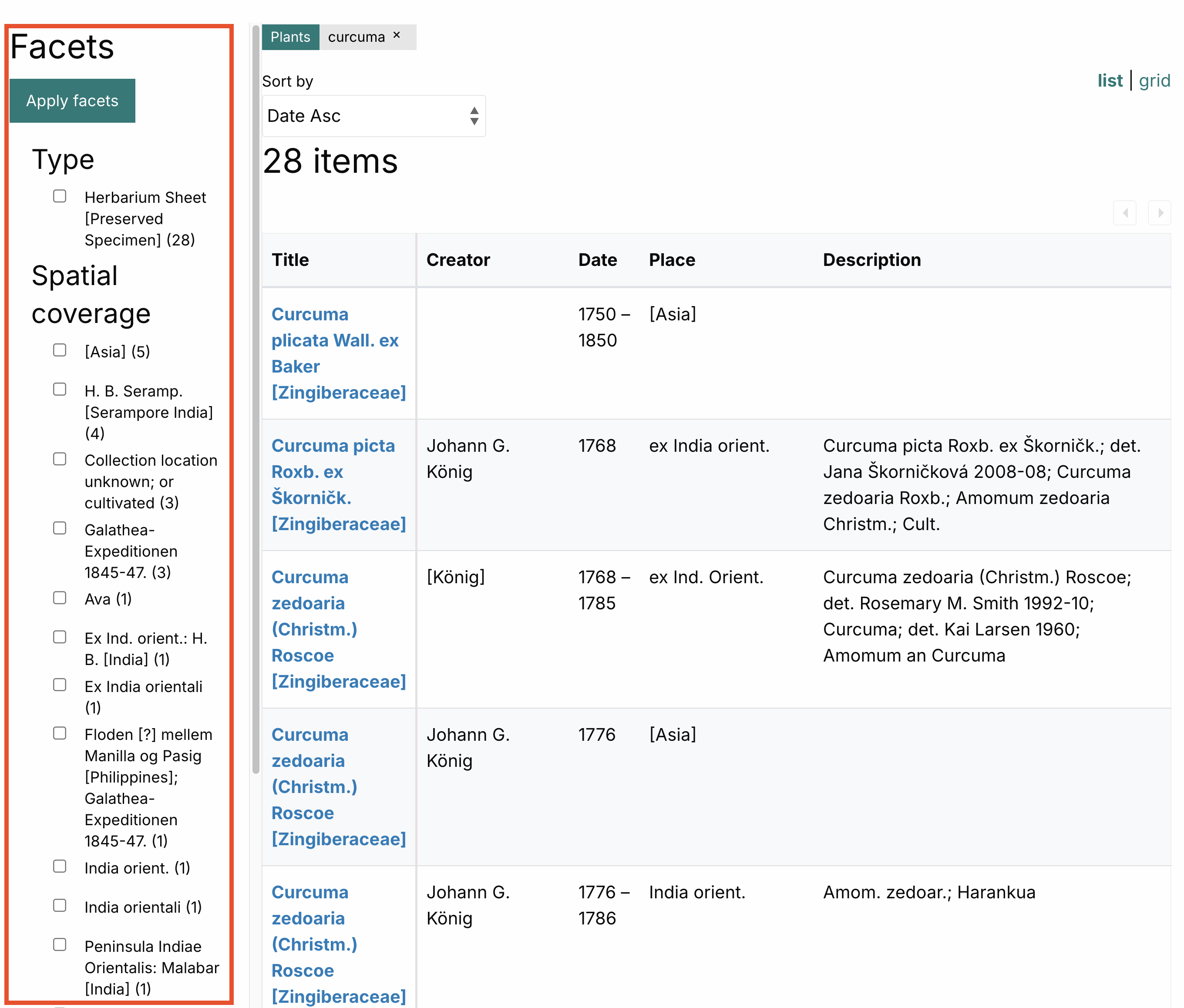 On all search result pages across the portal, whether via Free Text Search, Colonial Contexts Search, or Search Everything, you have a set of filtering options on the left hand side of the page. These filters are dynamic and will present you with options that can be found within the search results that you have already requested: this offers you 'search within search' functionality. Select a filter of interest and click Apply Facets.