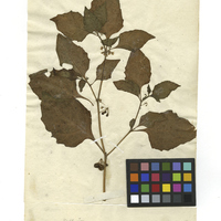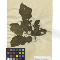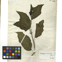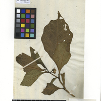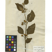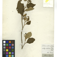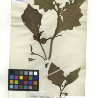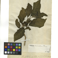 | Solanum macrocarpon L. [Solanaceae] | Peter Thonning | southern part of the country [Ghana] | On sheet: HB. SCHUM. 117. Solanum (gemellum m: crossed out) oleraceum Th: Collect: Guin. D. Thon. On label: Solanum macrocarpum L. det. Bitter ... | |