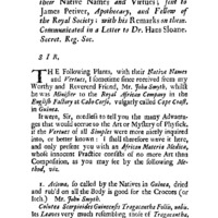 | A catalogue of some Guinea-Plants, with their Native Names and virtues; sent to James Petiver, apothecary, and Fellow of the Royal Society; with his remarks on them. Communicated in a letter to Dr. Hans Sloane. Secret. Reg. Soc. (II) | Petiver, James | Danish Gold Coast of Africa 1663 – 1850 | ||