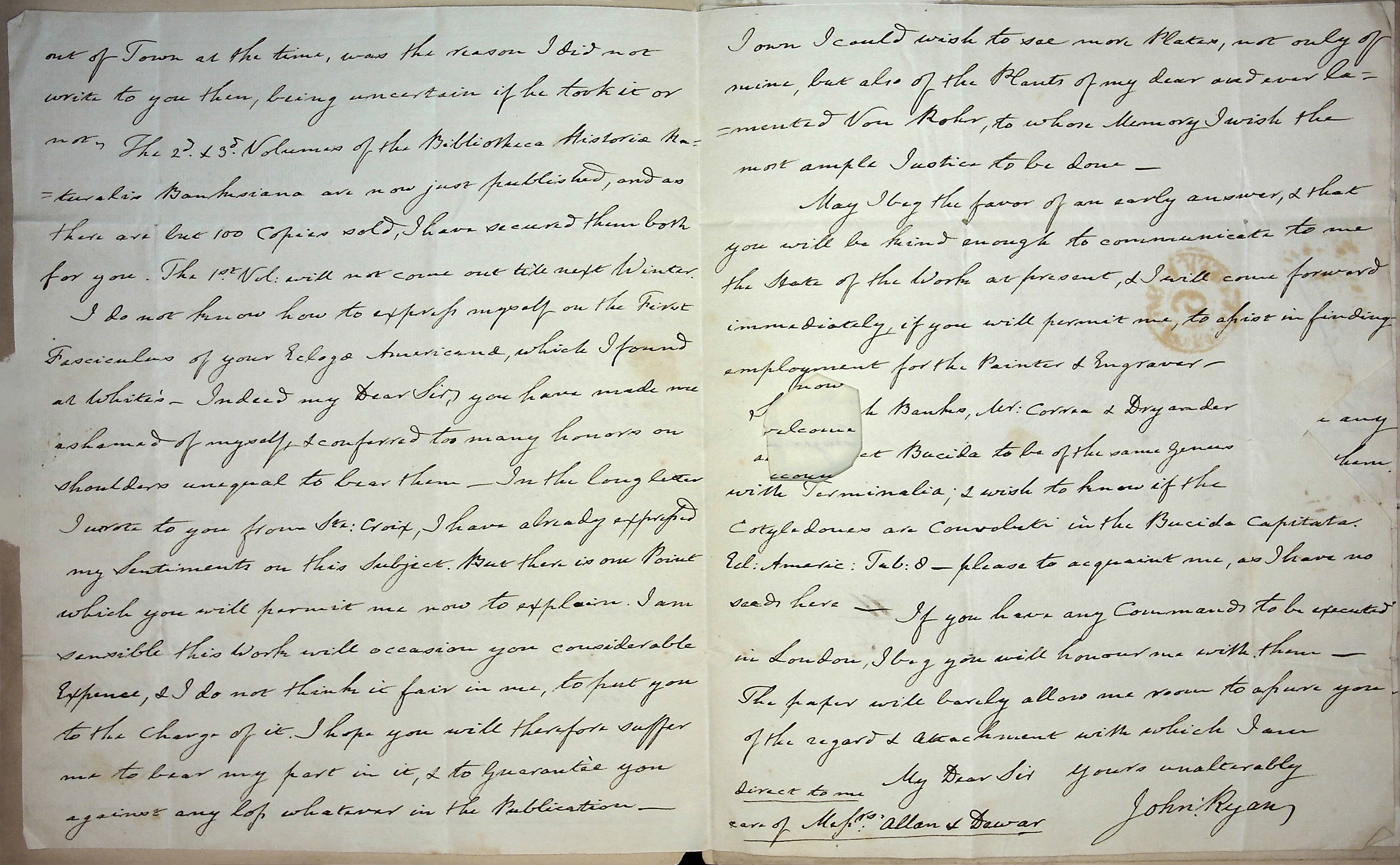 I do not know how to express myself on the First Fascicules of your Eclogae Americanae, which I found at Whites — Indeed my Dear Sir, you have made me ashamed of myself and conferred too many honours on shoulders unequal to bear them —- in the long letter I wrote to you from Ste Croix, I have already expressed my sentiments on this subject. But there is one Point which you will permit me now to explain. I am sensible this work will occasion you considerable expense, and I do not think it fair in me, to put you to the charge of it. I hope you will therefore suffer me to bear my part in it, and to guarantee you against any loss whatever in the Publication —-