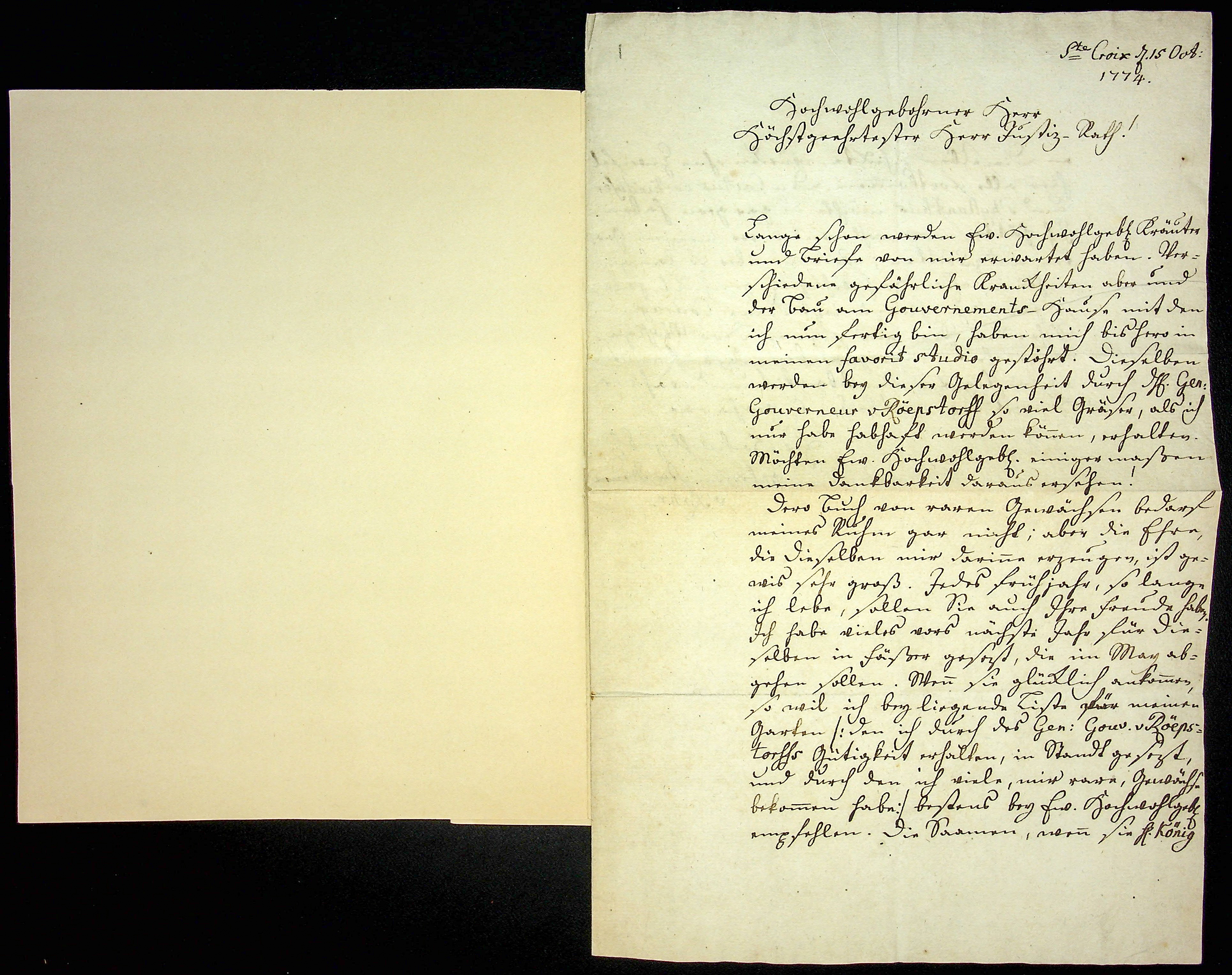 J.P.B. von Rohr to C.F. Rottbøll on 1774-10-15: Page #1 Original title: NHMD_34_L_J_P_B_von_Rohr_001.jpg Transcribe Browse revision history View notes 1 of 7 Reset Transcription [No transcription] Metadata